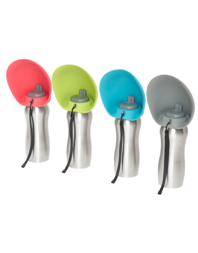 Messy Mutts makes traveling with your canine companion a breeze! With this convenient Travel Water Bottle, you'll never run out of water for your pooch again! You can now go on endless adventures with your furry best friend and keep them hydrated along the way! Perfect portability for travel, long walks, hikes, and more! Simply unfold the silicone bowl and press the open button for easy pouring to release water into the bowl and hydrate your pup! Unused water drains back into the bottle for later use to prevent waste. The water bottle is made from durable stainless steel and the bowl is made from pet-safe silicone material. BPA & PVC-Free. Recommended by the Pet Beastro to keep your pup hydrated on long trips!